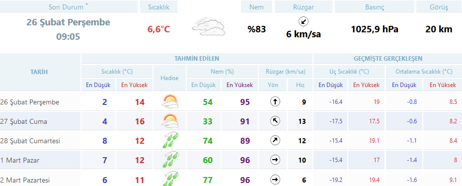 Yapılan son değerlendirmelere göre; Ülkemizin iç ve batı kesimleri ile zamanla doğusunun parçalı ve çok bulutlu, Marmara, Ege, Akdeniz, İç Anadolu, Batı ve Orta Karadeniz'in iç kesimleri, Doğu Anadolu'nun batısı ile Güneydoğu Anadolu'nun yağmur ve sağanak, Güney Ege kıyıları ile Batı Akdeniz kıyılarının yer yer gök gürültülü sağanak yağışlı, Sabah ve gece saatlerinde iç bölgelerin yükseklerinin karla karışık yağmur ve yer yer kar yağışlı geçeceği tahmin ediliyor.