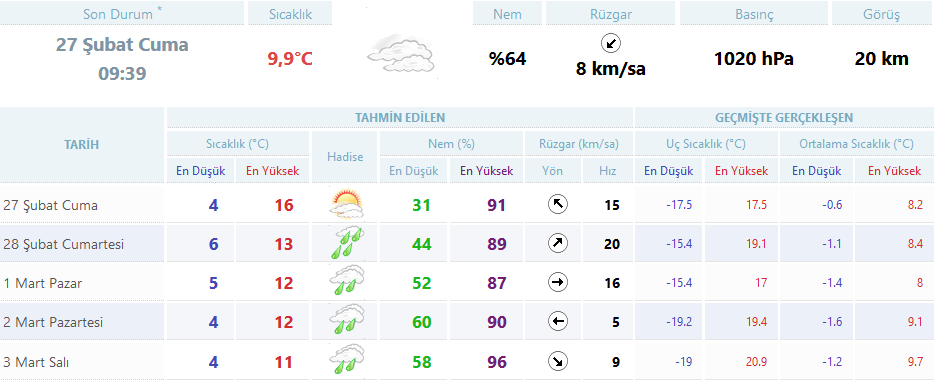 Meteoroloji Genel Müdürlüğü'nden alınan tahminlere göre 5 günlük hava durumu.