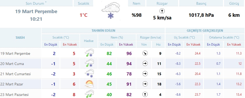 Meteoroloji Genel Müdürlüğü'nden alınan son hava tahmin raporuna göre yurdun bazı kesimlerimde kar yağışı ve fırtına uyarısı yapıldı.İstanbul'da Perşembe günündne itibaren sıcaklıkların düşeceği belirtilirken yağışlı havanın etkili olacağı da bildirildi. Rüzgarın Doğu Karadeniz'in doğusunda akşam saatlerinden sonra batı ve güneybatı yönlerden 6-8 kuvvetinde fırtına şeklinde esmesi bekleniyor.