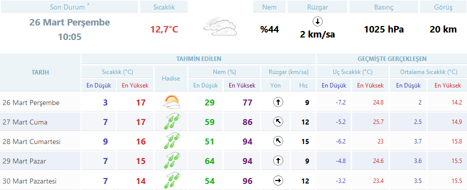 Meteoroloji Genel Müdürlüğü’nden alınan tahminlere göre 5 günlük hava durumu.