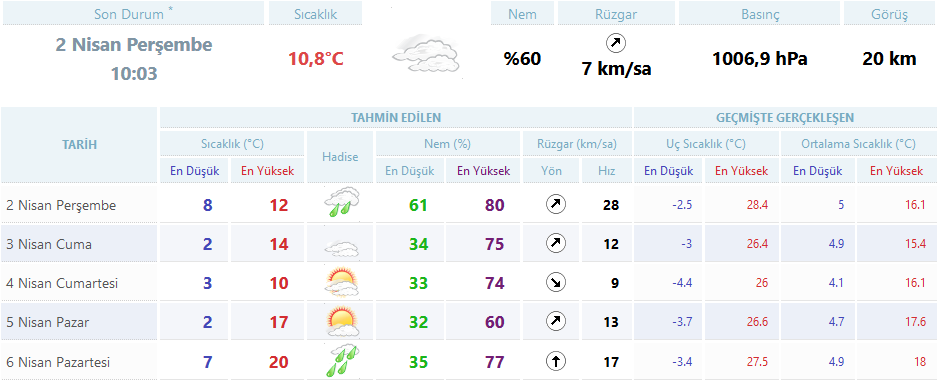 Meteoroloji Genel Müdürlüğü’nden alınan tahminlere göre 5 günlük hava durumu.