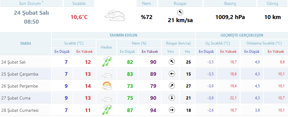 Meteoroloji Genel Müdürlüğü'nden alınan tahminlere göre 5 günlük hava durumu.