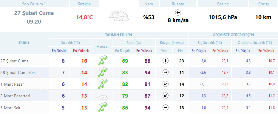 Yapılan son değerlendirmelere göre, Marmara’nın güney ve batısı, Ege, Batı Akdeniz, Kocaeli, Sakarya ve Erzurum çevreleri ile Eskişehir’in batı ilçelerinin yağışlı geçeceği tahmin ediliyor. Yağışların kıyı kesimlerde sağanak, iç kesimlerde hafif yağmur, Erzurum çevrelerinde hafif kar şeklinde olması bekleniyor.