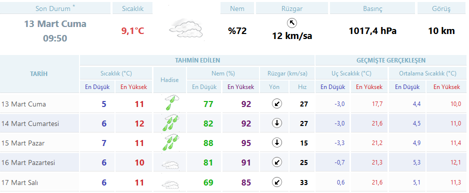 Meteoroloji Genel Müdürlüğü'nce yapılan son değerlendirmelere göre, yurt genelinin yağışlı geçeceği tahmin ediliyor. Yağışların; Doğu Anadolu'nun batısı, Adana, Osmaniye, Kahramanmaraş, Hatay, Adıyaman, Diyarbakır, Batman, Muş, Sivas ve Tokat çevrelerinde kuvvetli olmak üzere genellikle yağmur ve sağanak, Kıyı Ege ile Akdeniz kıyılarında yer yer gök gürültülü sağanak, Doğu Anadolu'nun kuzey ve doğusu, Doğu Karadeniz'in iç kesimleri ile Kastamonu, Sivas ve Çankırı çevrelerinde karla karışık yağmur ve yer yer kar şeklinde olması bekleniyor. Sabah ve gece saatlerinde Marmara'da yer yer pus ve sis ile birlikte Doğu Anadolu'nun doğusunda hafif buzlanma ve don olayı görüleceği tahmin ediliyor.