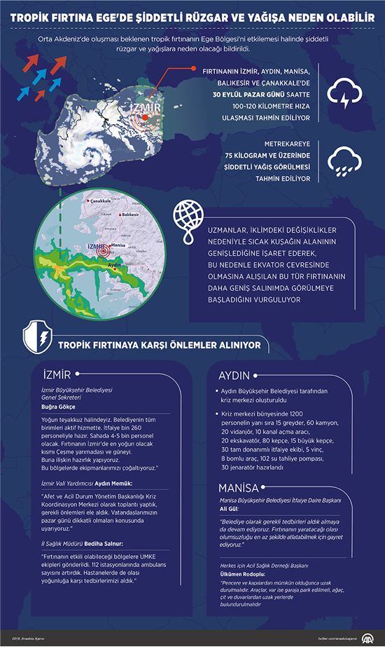 Ege'de tropik fırtınaya karşı önlemler alınıyor. AFAD, resmi sosyal medya hesabından yayımladığı broşürlerle "tropik fırtına" öncesi, sırası ve sonrasında vatandaşları önlem almaları konusunda bilgilendirdi.