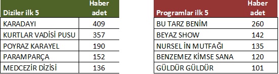 Farklı kanallara geçse de on yıldan fazladır ekranlarda gördüğümüz “Kurtlar Vadisi”; son versiyonu ‘Pusu’ ile Şubat ayının ikinci medyatik dizisi. “Poyraz Karayel” popüler diziler arasında üçüncü sırada yer alırken; “Bu Tarz Benim” yarışması Programlar kategorisinde ilk sırada raporlanıyor. Ekranların en uzun soluklu talk showu olarak bilinen “Beyaz Show” programlar arasında ikinciliği yakalarken “Nursel’in Mutfağı” çok konuşulanlar arasında üçüncü sırada yer alıyor.