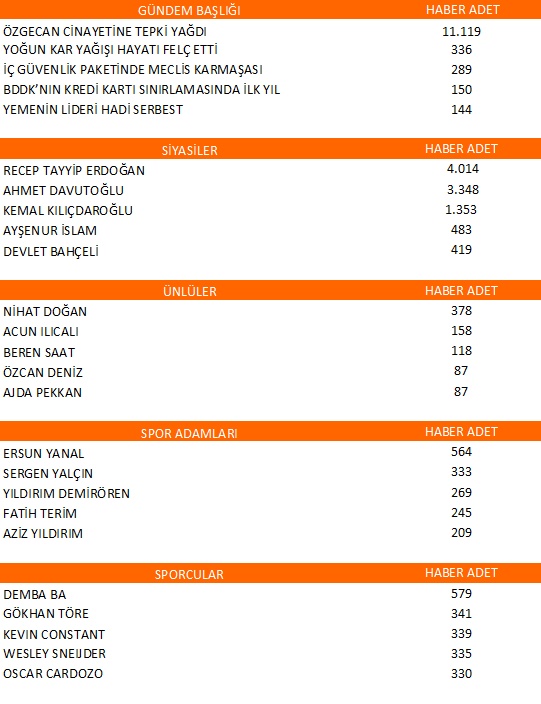 Özgecan cinayeti sonrası attığı tweet ile ortalığı karıştıran ve Türk halkının büyük tepkisini alan Nihat Doğan ünlüler camiasında en çok bahsi geçen isim olarak kaydedildi. Nihat Doğan’ı son dakika Survivor yarışmasından çıkararak tepkisini ortaya koyan Acun Ilıcalı da sıralamanın ikincisi olarak belirlendi. Özgecan cinayetini protesto etmek amacıyla sosyal medyada başına gelen tacizleri paylaşan Beren Saat 118 haberi ile bolca konuşulan medyatikler arasındaydı. Ünlü isimlerin listelendiği raporda sıralamayı eşit yansıma ile Özcan Deniz ve Ajda Pekkan izledi.