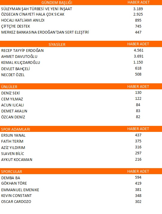 Cumhurbaşkanı Recep Tayyip Erdoğan 4 binden fazla haberi ile siyaset gündeminin ilk sırasına yerleşirken; Başbakan Ahmet Davutoğlu da 4 bine yakın haberle ikinci sırada raporlandı. CHP Genel Başkanı Kemal Kılıçdaroğlu siyaset medyasının üçüncü sırasında yer alırken; MHP Genel Başkanı Devlet Bahçeli sıralamada takip eden isim oldu. Genelkurmay Başkanı Necdet Özel ise siyaset gündeminde beşinci sırada yerini aldı.