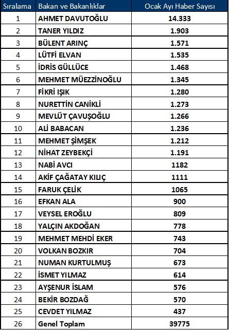 Başbakan Ahmet Davutoğlu’nun 14 bin 333 haberi tüm basın mecralarında başı çekiyor. Enerji ve Tabii Kaynaklar Bakanı Taner Yıldız’ın 2 bine yakın yansıma bulduğu sıralamada, Başbakan Yardımcısı Bülent Arınç ilk üçü tamamlayan isim olarak kaydedilmekte. Ulaştırma, Denizcilik ve Haberleşme Bakanı Lütfi Elvan ve Çevre ve Şehircilik Bakanı İdris Güllüce listede en fazla habere sahip bakanlar arasında.