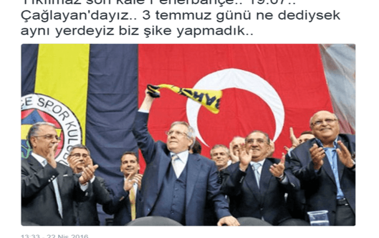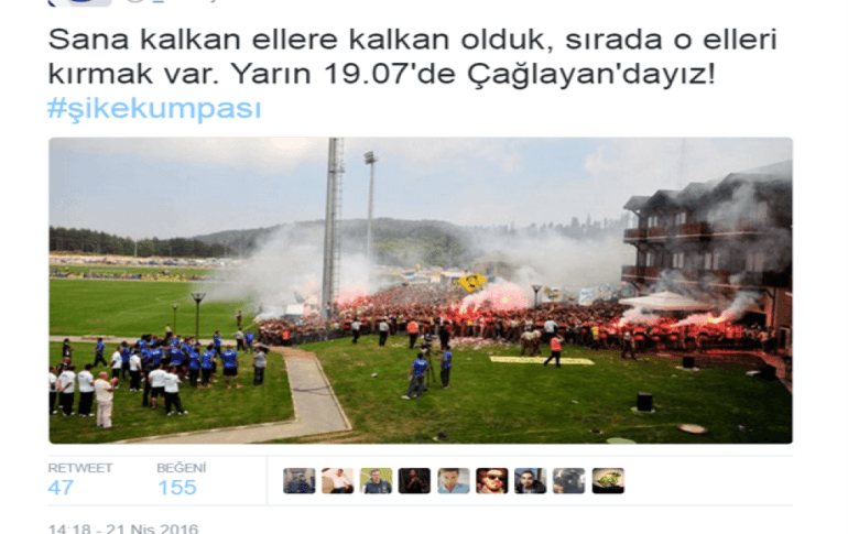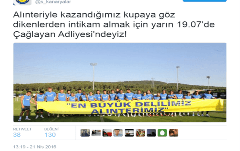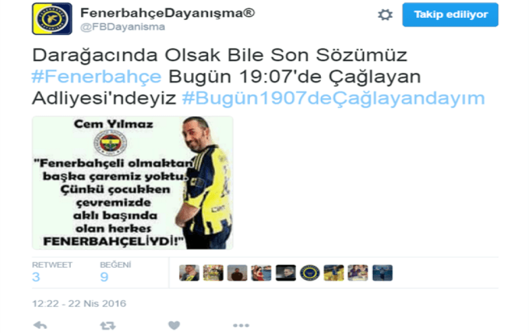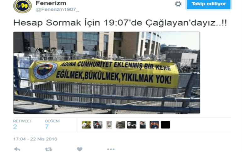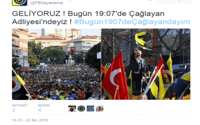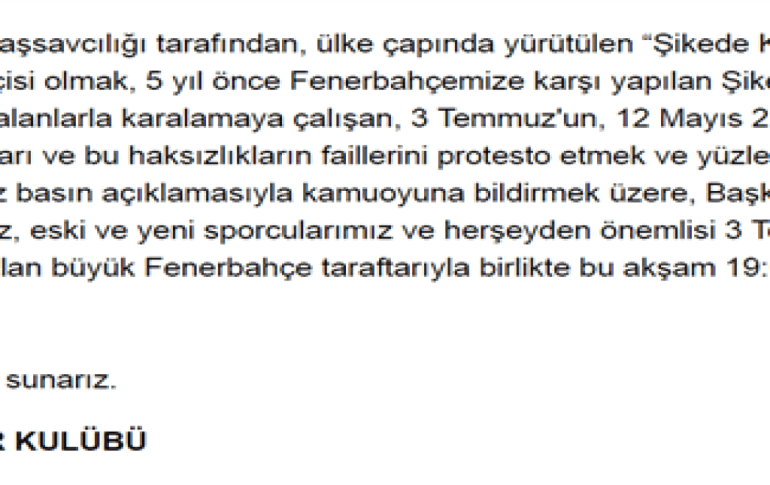 - Fenerbahçeli taraftarlar şike kumpas kapsamında kulübe atılan iftira ve karalamaya çalışanlara, haksızlıklara karşı protesto etmek, demoraktik yollar ile tepkilerini koymak için 19.07'de Çağlayan'da buluşuyorlar!