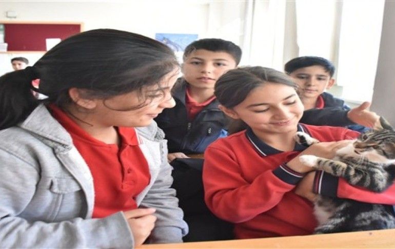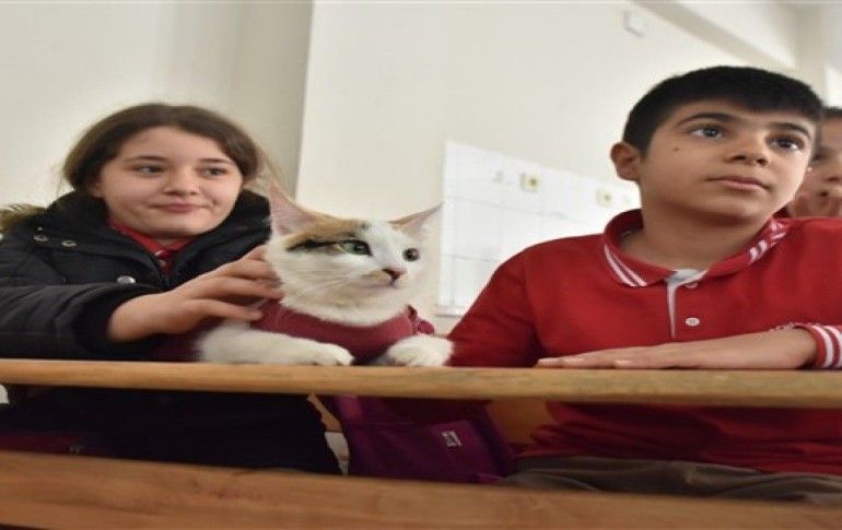 Adıyaman'da, 15 Temmuz Şehitler Ortaokulunda görevli memur Şafak Oruç'un hayata geçirdiği 'Her sınıfın hayvan dostu bulunsun' projesi kapsamında, öğrencilerin sahiplendiği iki sokak kedisi okulun maskotu oldu.